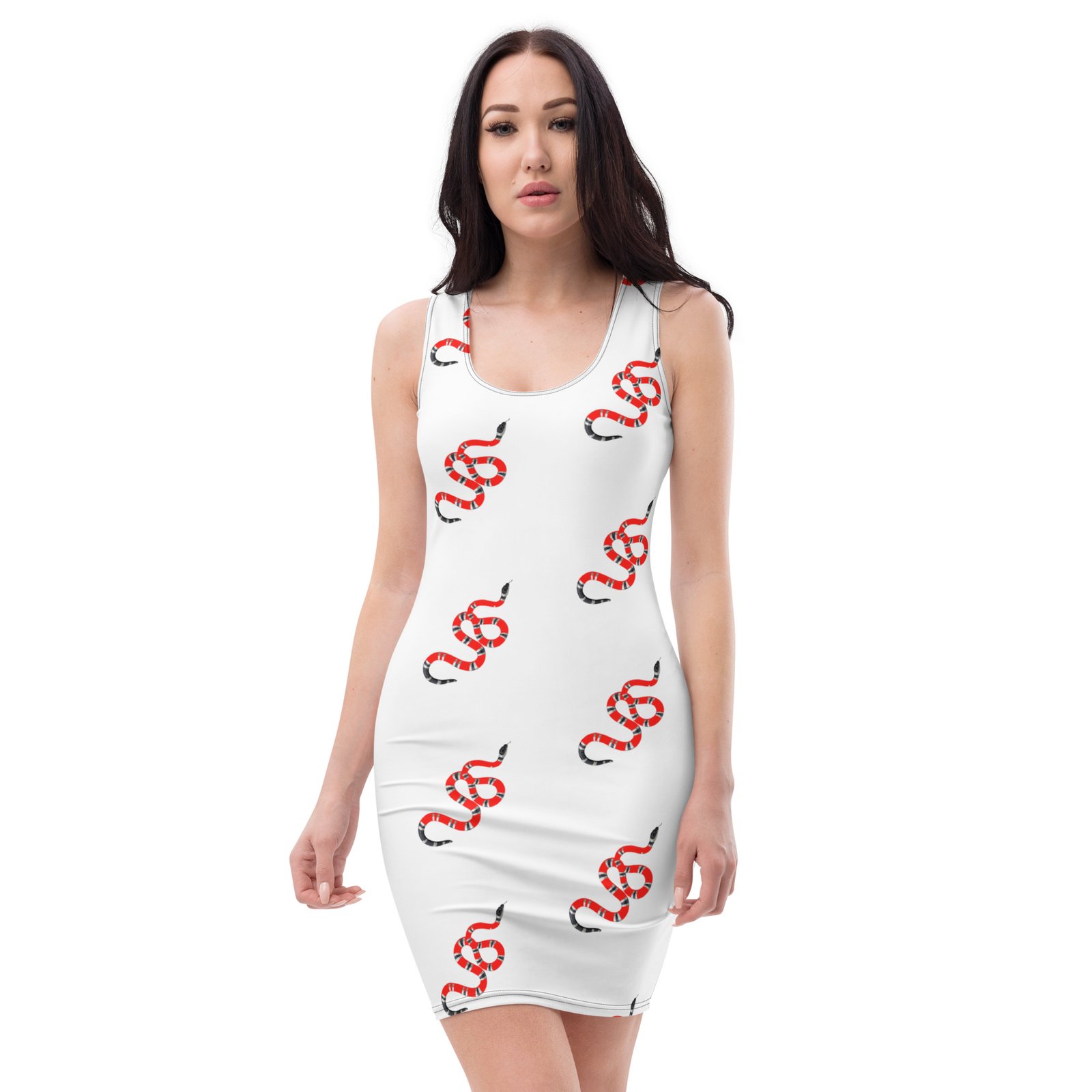 Design: All-over snake print with a fitted bodycon silhouette.