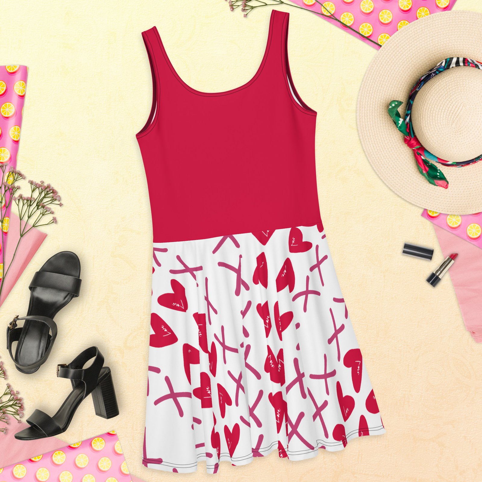 Design: Flared mid-thigh skirt with a sleeveless top and bold heart print.